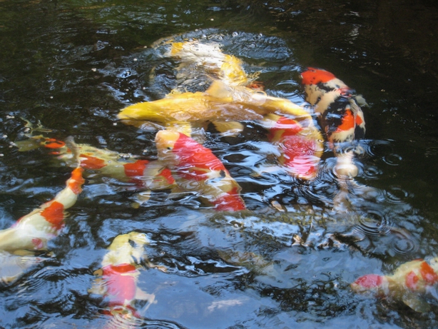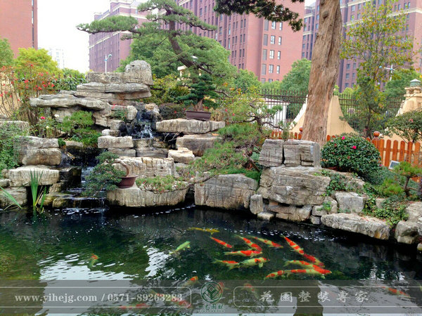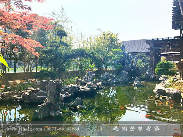 假山疊石,浮萍、水草、金魚(yú)渾然一體。