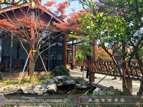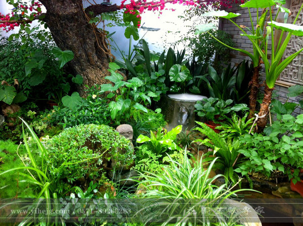 小空間,大水池,水里金魚(yú)嬉戲,岸上植物茂盛,陶罐上的流水更是畫龍點(diǎn)睛的奇妙。
